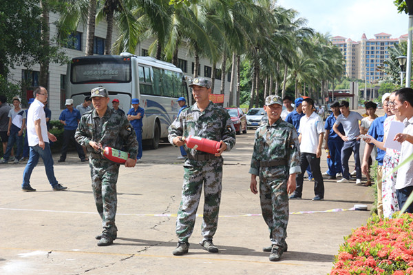 6月28日上午開展的“消防演習(xí)大比拼”,則在知識競賽參賽隊(duì)伍的基礎(chǔ)上多出了一支保衛(wèi)部代表隊(duì)。為了提高此次演習(xí)的操作水平,海南欣龍無紡股份還特別邀請了武警消防中隊(duì)的官兵到場指導(dǎo)和講解。本次消防比拼分為撲滅纖維火災(zāi)和電器火災(zāi)兩部分,要求當(dāng)火情發(fā)生時,首先要發(fā)出警告,對現(xiàn)場無關(guān)人員進(jìn)行疏導(dǎo),撤離到安全地帶。然后要求參賽代表辨別火情,依次按照滅火要求,相互配合,正確使用滅火器和各類消防器材,盡快撲滅火情。