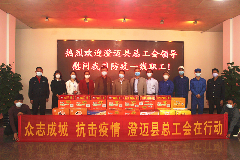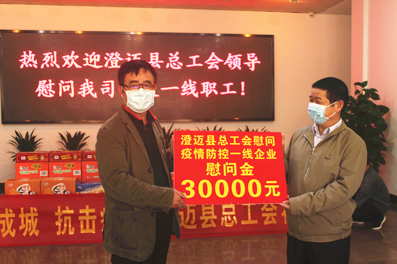 2月13日,澄邁縣委常委魏和金、縣總工會主席潘思群一行到我司看望慰問近日來一直堅(jiān)守在疫情防控物資原料生產(chǎn)一線的工作人員,向他們的辛勤付出表示感謝,囑咐大家一定要保重身體,注意自身的防護(hù)工作,并為他們送去3萬元慰問金和餅干、涼茶、方便面等5000元慰問物資。