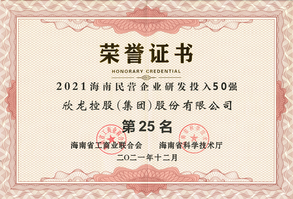 2021年12月27日,由海南省工商聯(lián)、海南省科技廳共同組織的“2021海南民營(yíng)企業(yè)研發(fā)投入50強(qiáng)榜單”發(fā)布活動(dòng)在海口舉行。會(huì)上發(fā)布的年度民企研發(fā)投入榜單中,欣龍控股位列第25位。