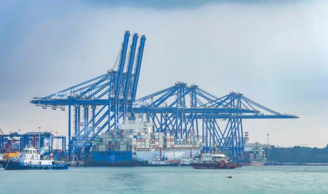 在洋浦國際集裝箱碼頭,一艘貨輪正在碼頭裝卸貨物。海南日報全媒體記者陳元才攝