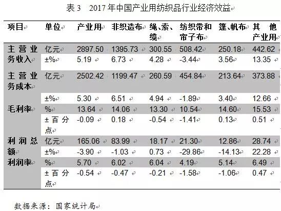 根據(jù)國家統(tǒng)計局?jǐn)?shù)據(jù),2017年我國產(chǎn)業(yè)用紡織品行業(yè)規(guī)模以上企業(yè)的主營業(yè)務(wù)收入和利潤總額分別為2897.5億元和165.1億元,分別增長5.19%和降低3.90%,這是行業(yè)“十二五”以來利潤總額首次出現(xiàn)下降。行業(yè)利潤總額下降的原因是:首先,紡織帶和簾子布領(lǐng)域持續(xù)低迷,2017年該領(lǐng)域的主營業(yè)務(wù)收入降低3.44%,成本僅降低1.89%,致使其毛利率降低了1.41個百分點(diǎn),進(jìn)而利潤總額大幅降低近30%;其次,2017年主要化纖原材料價格的波動,企業(yè)難以在短期內(nèi)將價格壓力全部傳遞至用戶,影響到企業(yè)的盈利;第三,近年來行業(yè)投資活躍,產(chǎn)能增長快,市場難以在短期內(nèi)全部消化這些新增產(chǎn)能,使得部分領(lǐng)域內(nèi)企業(yè)競爭激烈,產(chǎn)品的銷售價格承受了較大的壓力。根據(jù)協(xié)會的調(diào)研,企業(yè)普遍反應(yīng)產(chǎn)品的銷售價格難以與原材料同步上漲,海關(guān)數(shù)據(jù)也顯示大部分商品的出口價格都出現(xiàn)了不同程度的下降。
