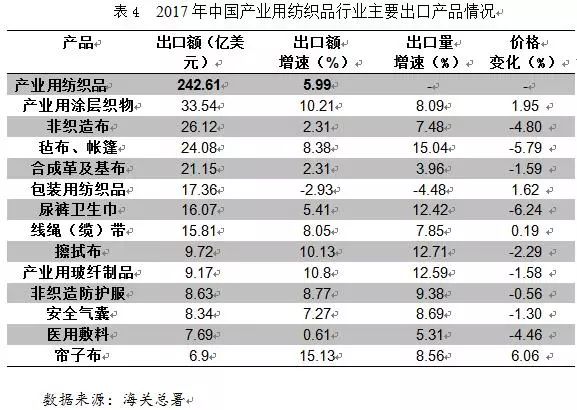 隨著我國產(chǎn)業(yè)用紡織品的技術(shù)進(jìn)步、“一帶一路”倡議的深入推進(jìn)以及主要發(fā)達(dá)國家經(jīng)濟(jì)復(fù)蘇,行業(yè)內(nèi)企業(yè)在開拓國際市場方面取得了很大的進(jìn)展。2017年產(chǎn)業(yè)用紡織品行業(yè)出口242.61億美元,同比增長5.99%,扭轉(zhuǎn)了連續(xù)多年來出口低速增長甚至下降的局面;同期我國進(jìn)口產(chǎn)業(yè)用紡織品70.54億美元,同比增長12.18%,進(jìn)口的大幅增加表明中國經(jīng)濟(jì)充滿活力,對高技術(shù)含量、高品質(zhì)產(chǎn)品的需求依然比較旺盛。