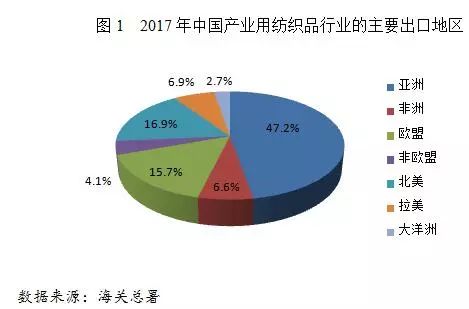 圖1顯示,亞洲是我國產(chǎn)業(yè)用紡織品最大的出口地區(qū),占全年出口額的47.2%,其次是北美和歐盟市場,份額分別為16.9%和15.7%,非洲和拉美市場的份額分別為6.6%和6.9%。