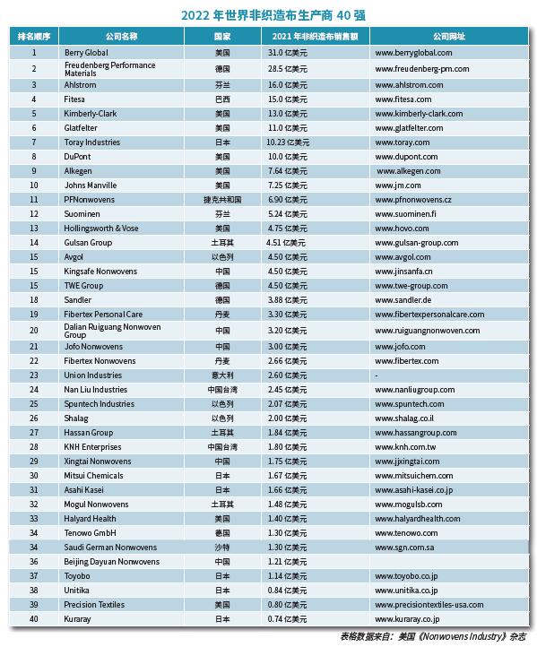 今年的四十強(qiáng)報(bào)道包括位于全世界范圍內(nèi)的40家非織造布生產(chǎn)商。雖然許多領(lǐng)先公司都位于美國(guó)和西歐這些成熟市場(chǎng),但來(lái)自發(fā)展中國(guó)家和地區(qū)的公司正在發(fā)揮更大的作用。今年,來(lái)自巴西、土耳其、中國(guó)和捷克等發(fā)展中國(guó)家的公司仍然保持了銷售額的增長(zhǎng)。其中許多公司在新生產(chǎn)線投資和收購(gòu)方面下了很大功夫,這意味著它們的排名在未來(lái)幾年內(nèi)還將提升。